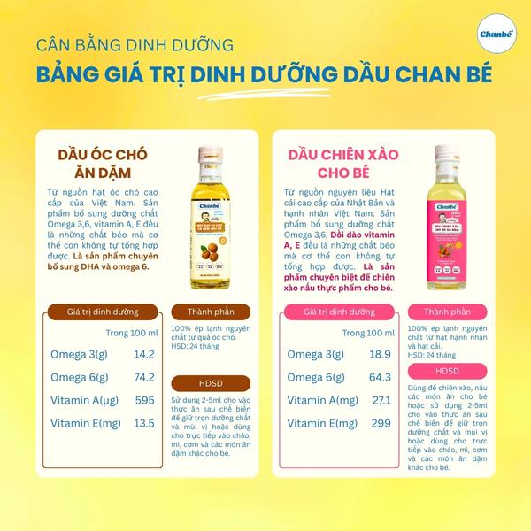 Dầu ăn dặm Chan Bé dành cho bé từ 6 tháng tuổi hoặc mới bắt đầu tập ăn dặm.