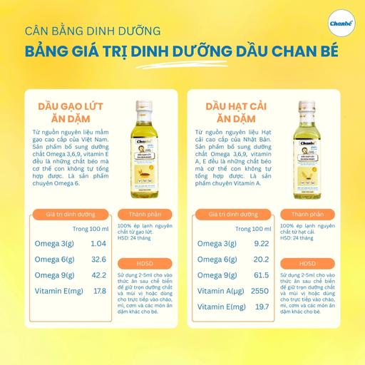 Dầu ăn dặm Chan Bé dành cho bé từ 6 tháng tuổi hoặc mới bắt đầu tập ăn dặm.