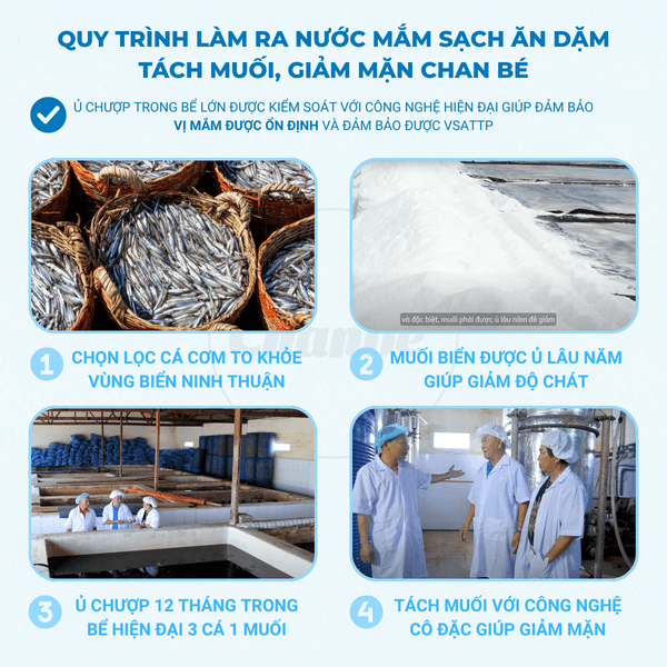 Tách muối giảm mặn: Được tách muối giảm mặn bằng máy cô chân không và phương pháp phơi mắm trong nhà máy, giúp giảm vị mặn mà vẫn giữ trọn hương vị.
