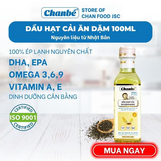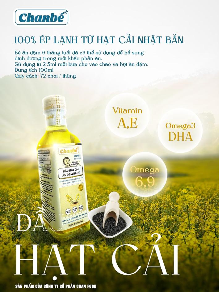 Dầu ăn dặm Hạt Cải Chan Bé là dầu nguyên chất 100% ép lạnh từ hạt cải, giàu Omega 9 và Vitamin A giúp bé phát triển toàn diện.