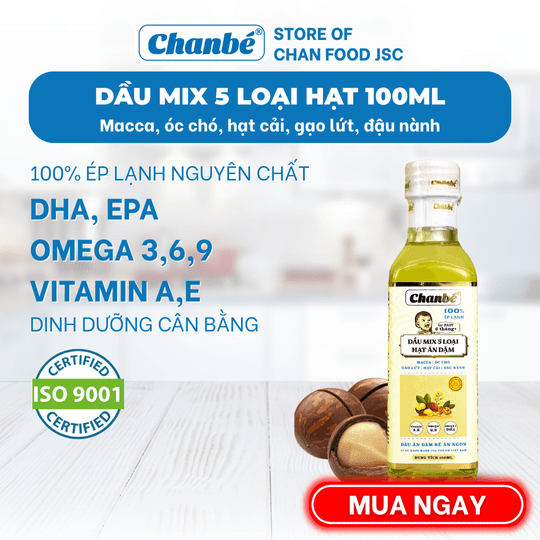 Dầu ăn dặm Mix 5 Loại Hạt Chan Bé là dầu nguyên chất 100% ép lạnh từ macca, hạt óc chó, gạo lứt, hạt cải và đậu nành – sự kết hợp hoàn hảo giữa nhiều loại hạt giúp bé hấp thu đa dạng dưỡng chất.