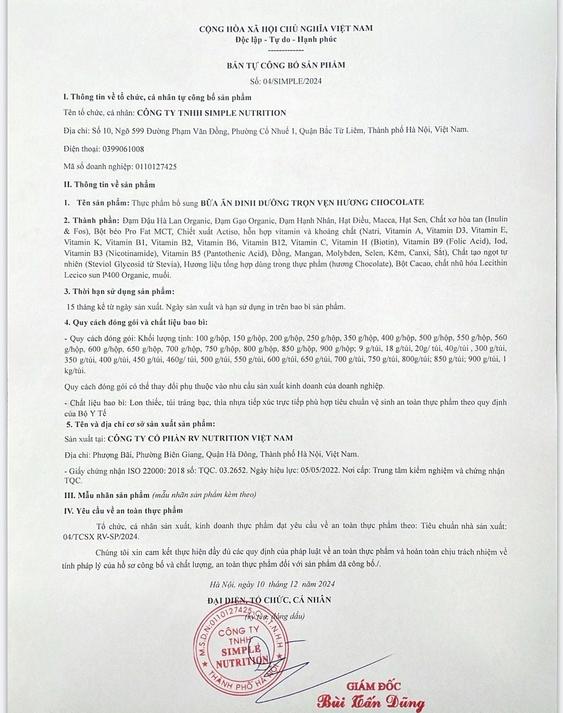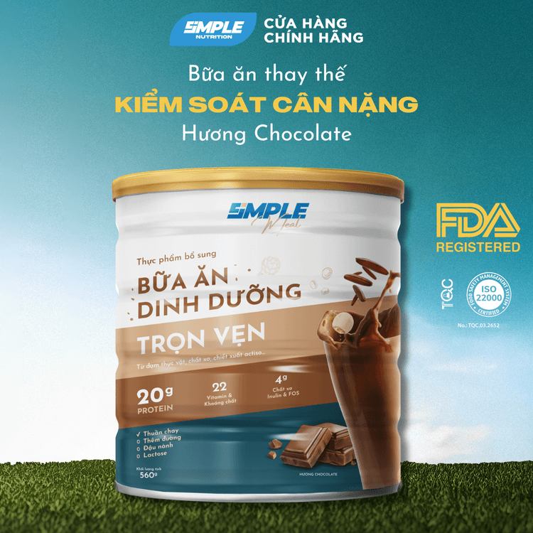 Bữa ăn dinh dưỡng trọn vẹn Simple Nutrition hương Socola là sản phẩm cung cấp nguồn dinh dưỡng cân bằng, tiện lợi cho những người bận rộn, người cần kiểm soát chế độ ăn hoặc bổ sung năng lượng nhanh chóng trong ngày.