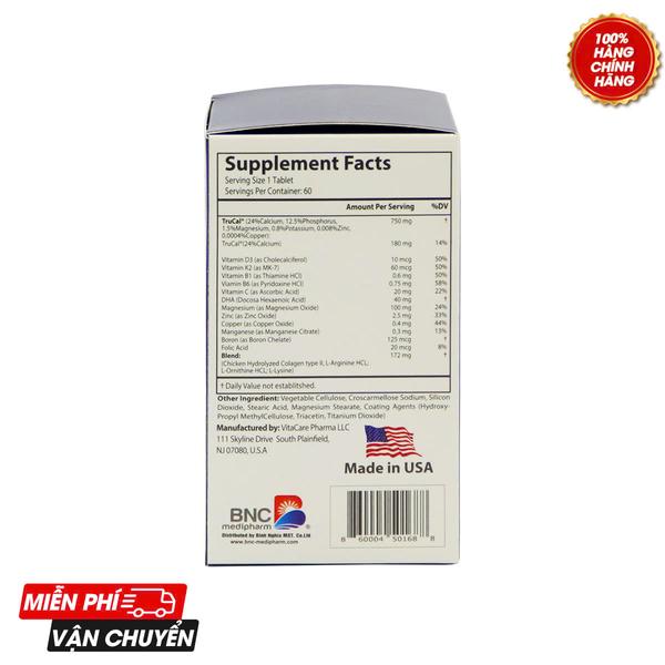Tru-Cal® (24% Canxi, 12,5% Phốt pho, 1,5% Magiê, 0,8% Kali, 0,008% Kẽm, 0,0004% Đồng): ..................750mg,