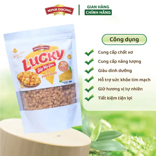 Ngô nếp phô mai sấy giòn LUCKY Minh Dương Food là món snack giòn rụm, béo thơm vị phô mai, phù hợp để ăn vặt hằng ngày, xem phim, tụ họp bạn bè hoặc mang theo khi đi học, đi làm.