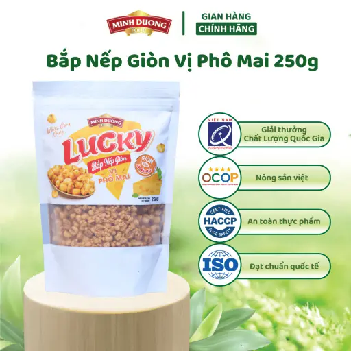 Bạn đang tìm một món snack giòn rụm, thơm béo, ăn vặt cực cuốn? Ngô nếp phô mai sấy LUCKY Minh Dương Food là lựa chọn hoàn hảo cho những tín đồ ăn vặt. Sản phẩm được làm từ 100% hạt ngô nếp tươi, sấy bằng công nghệ hiện đại giúp giữ trọn hương vị tự nhiên, kết hợp cùng phô mai béo ngậy tạo nên món ăn vặt thơm ngon và hấp dẫn.