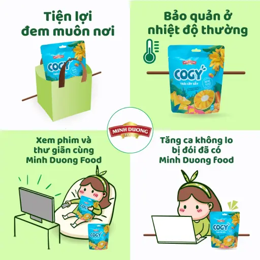 Nếu bạn đang tìm một món snack trái cây giòn ngon, tự nhiên và tiện lợi, hãy thử ngay Trái Cây Sấy Hỗn Hợp COGY Minh Dương Food để thưởng thức nhiều hương vị hấp dẫn trong một gói.