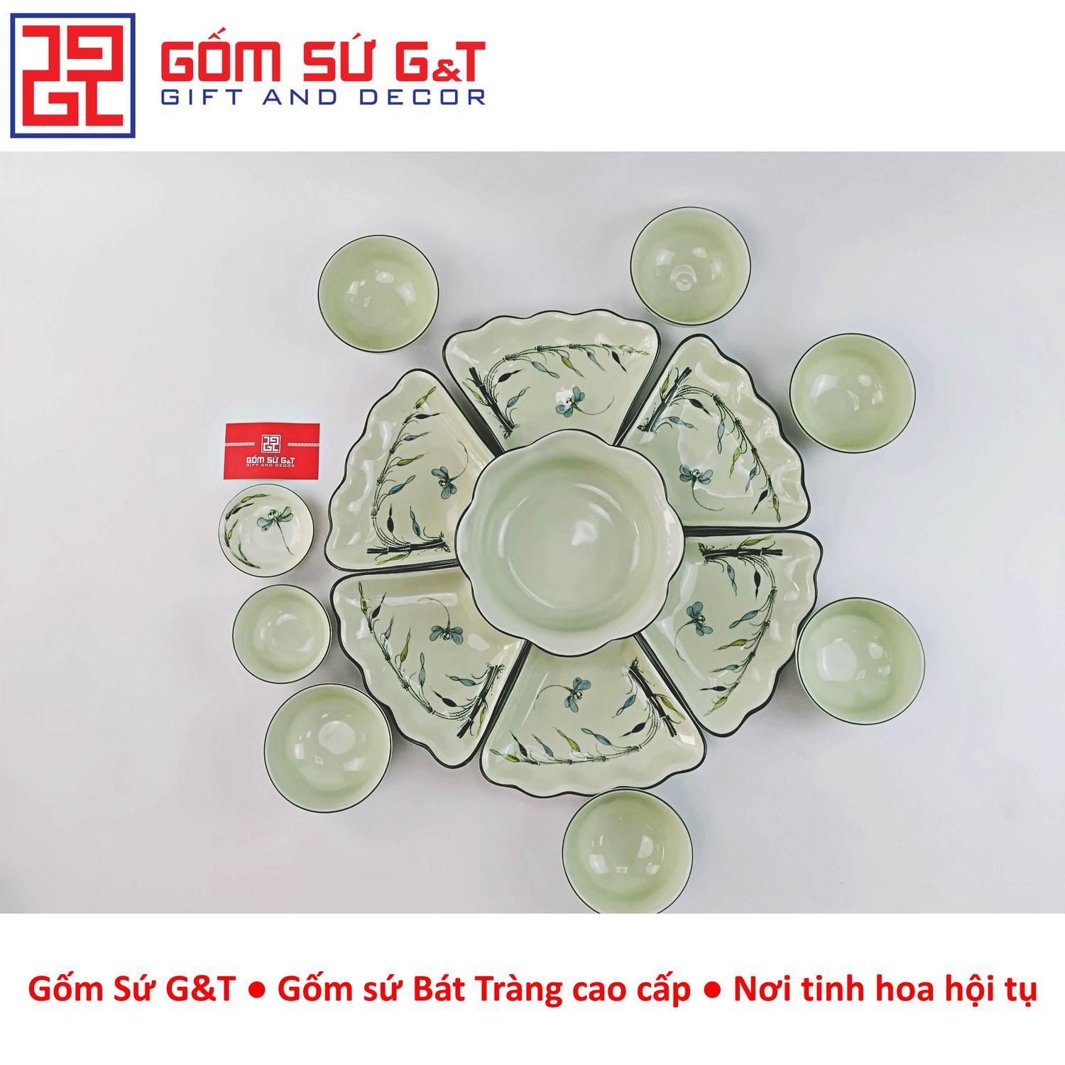 Bộ đồ ăn 10 người men xanh đồng vẽ hoa bèo