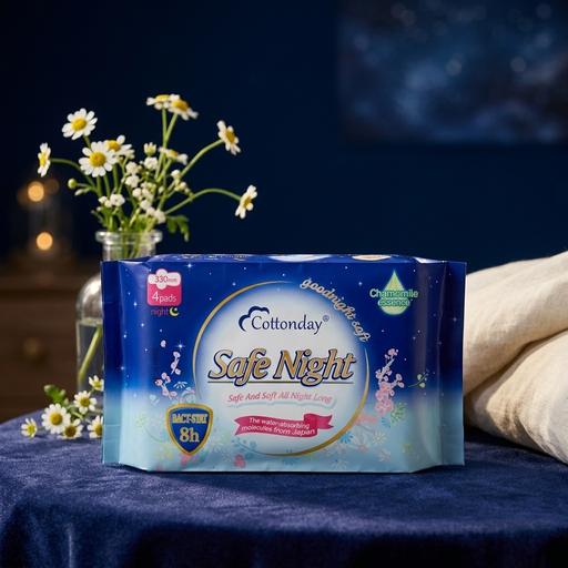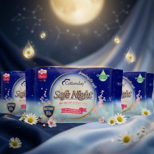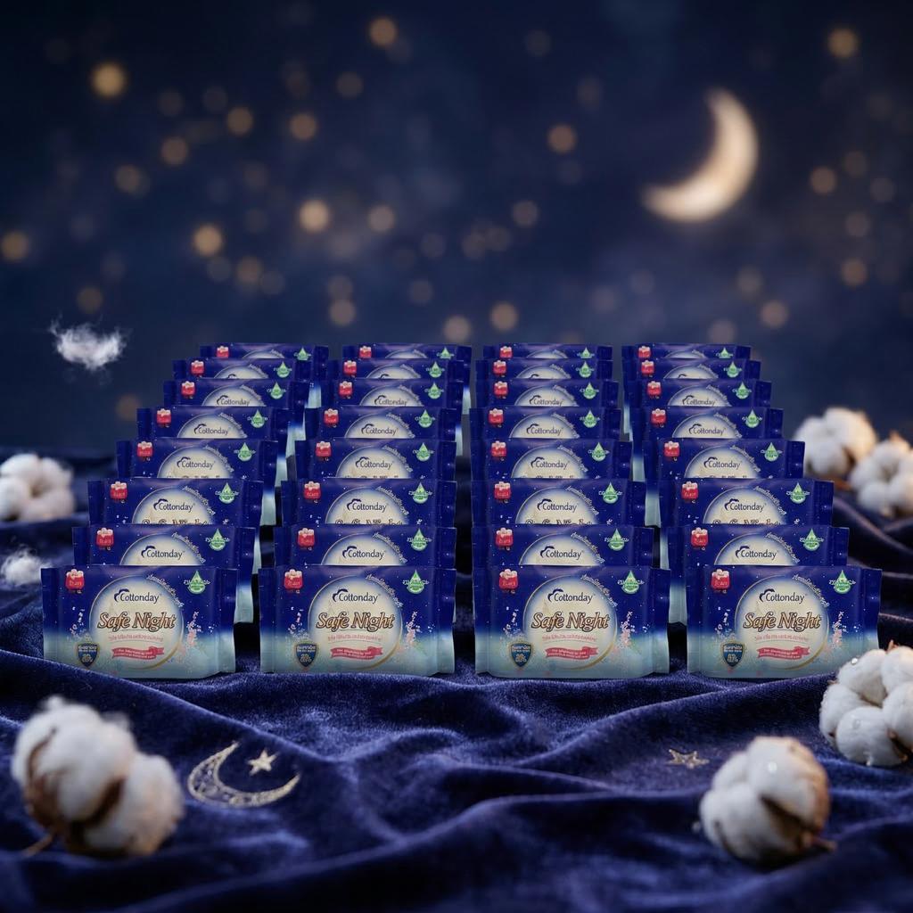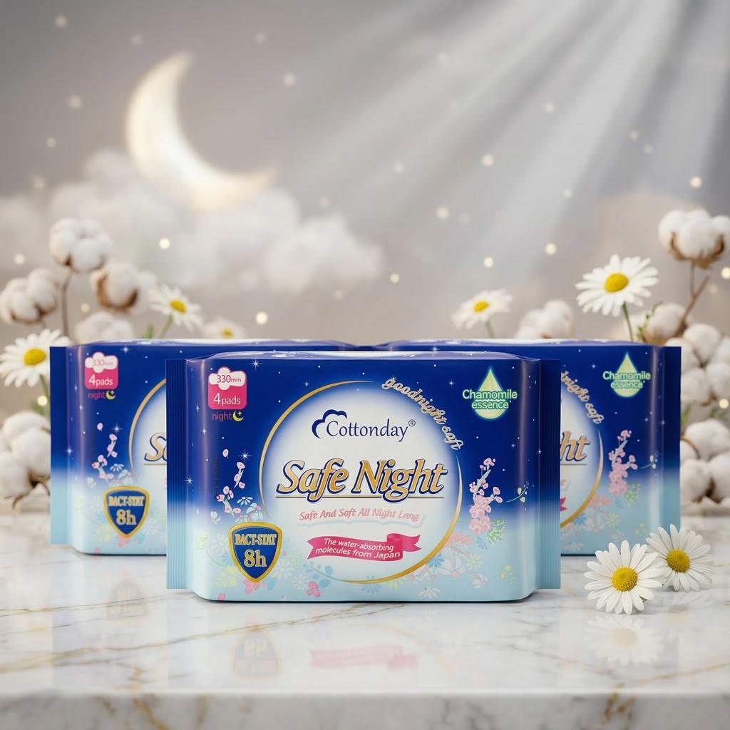 Với chiều dài lý tưởng và khả năng thấm hút vượt trội, Cottonday Ban Đêm là "vệ sĩ" hoàn hảo giúp phái đẹp gạt bỏ lo âu về việc tràn băng. Sản phẩm mang lại sự khô thoáng, kháng khuẩn và cảm giác mát mẻ để bạn tận hưởng giấc ngủ trọn vẹn nhất.
