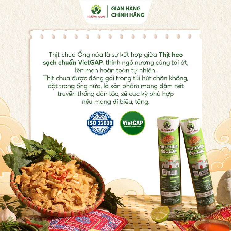 Thịt chua được đóng gói trong túi hút chân không, đặt trong ống nứa, là sản phẩm mang đậm nét truyền thống dân tộc, sẽ cực kỳ phù hợp nếu mang đi biếu, tặng. Khối lượng tịnh: 180G