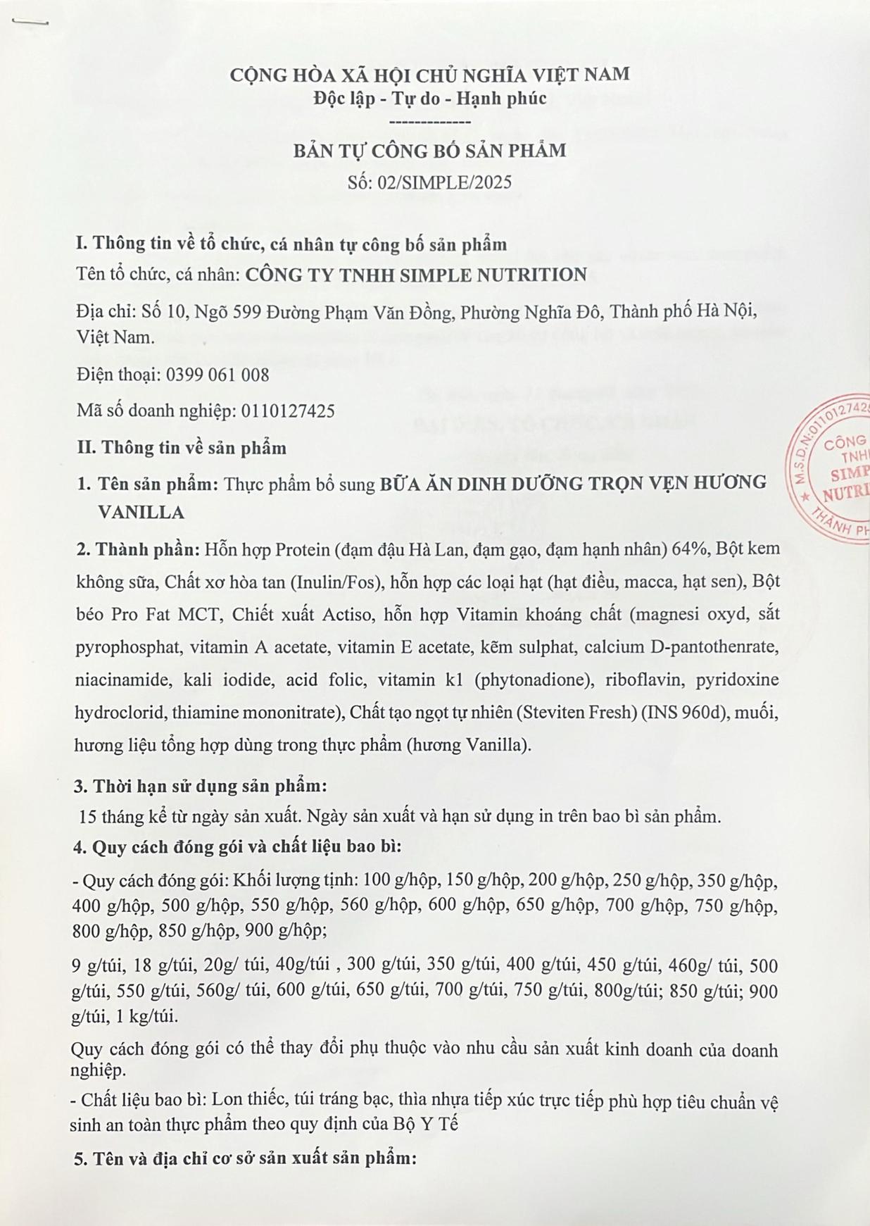 Bữa ăn dinh dưỡng trọn vẹn Simple Nutrition – Hương Vanilla (560g)