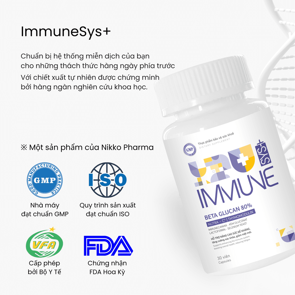 Viên uống Immune Sys+ có thành phần chính là Beta-glucan, Nutra-C (Vitamin C không có tính axit), Thymomodulin, Kẽm, Selenium Yeast, Lactoferrin là những hoạt chất quan trọng giúp kích hoạt chức năng của các tế bào khác nhau trong cả hệ thống miễn dịch.