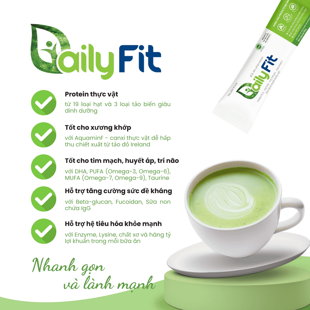 DailyFit giúp cung cấp protein từ thực vật với hàm lượng cao, chiết xuất từ hơn 19 loại hạt dinh dưỡng gồm yến mạch, gạo lứt, hạt sen, hạt óc chó, hạt macca, hạnh nhân, hạt điều, mè đen, hạt bí, hạt chia, hướng dương, hạt dẻ cười, các loại đậu (đậu xanh, đậu đen, đậu đỏ, đậu ngự, đậu trắng, đậu lăng, đậu Hà Lan) và 3 loại tảo biển (tảo đỏ, tảo nâu, tảo xoắn spirulina)