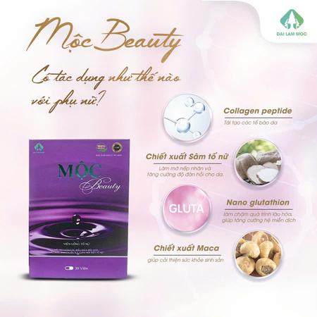 Mộc Beauty là sản phẩm hỗ trợ chăm sóc sức khỏe và sắc đẹp cho phụ nữ, kết hợp các thành phần từ thảo dược và dưỡng chất như isoflavone, collagen, vitamin E.